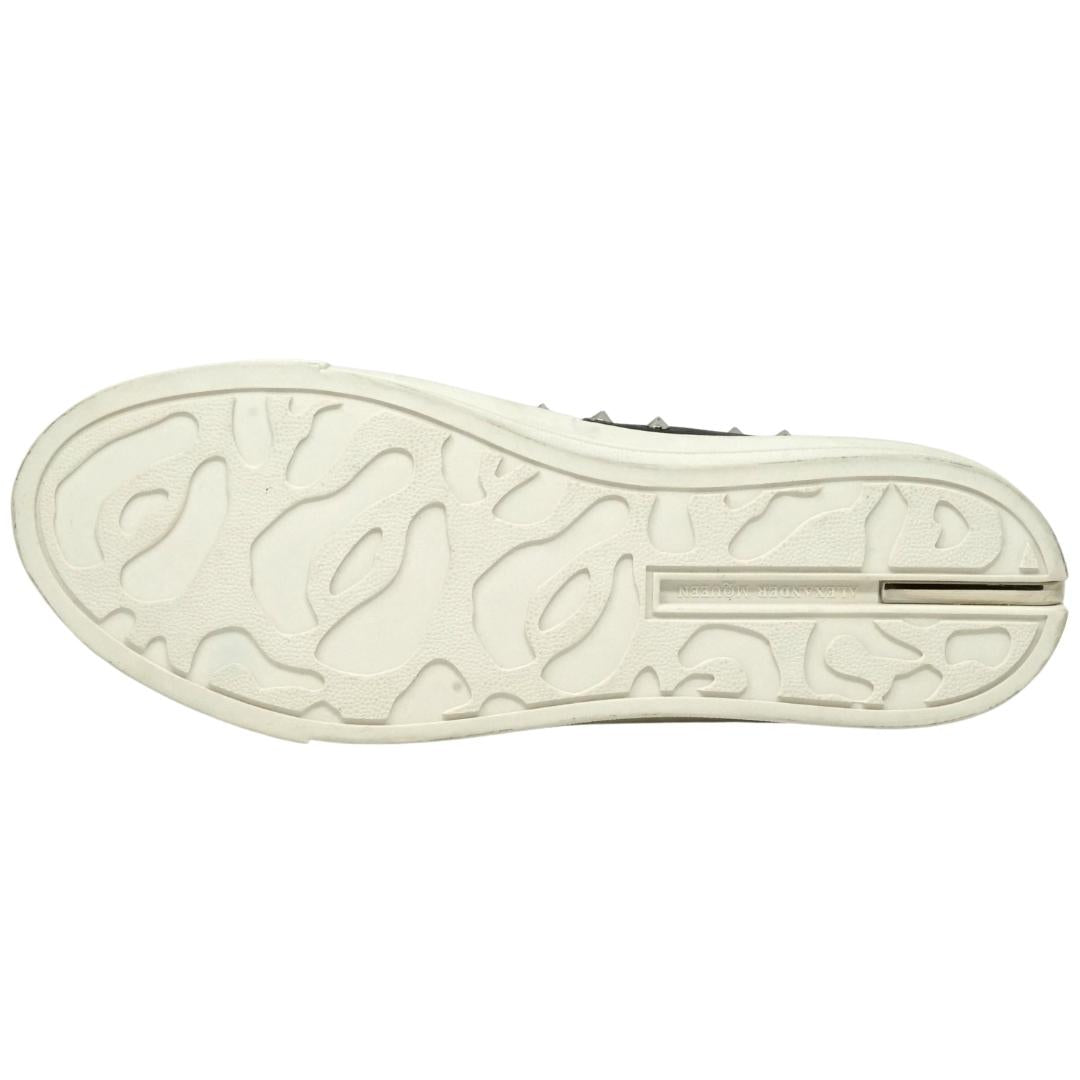 Alexander Mcqueen Studded Black Sneaker. Step out in style with the Alexander Mcqueen Black Sneaker! This streetwear favorite features a black heel for a modern and edgy look. Perfect for a night out or a casual day, you'll be in comfort and looking great. Make a statement and get the look now!. Studs All-over Design. Rubber Sole, Lace Fasten. 100% Leather. Style Code: 462767 WHS8P0110