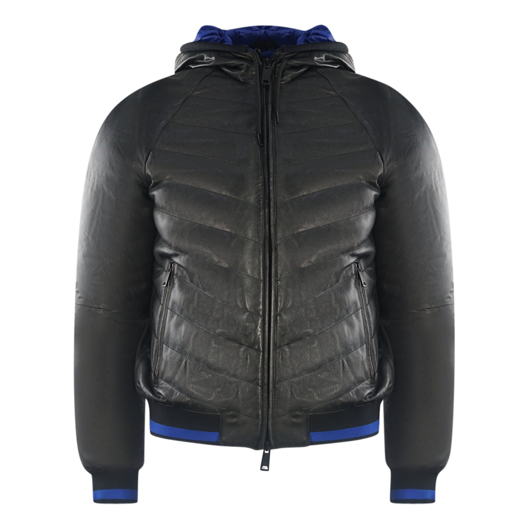 Armani Jeans ZGB04P ZGP03 Jacket. Armani Black Leather Jacket. Central Zip Closure. Elasticated Sleeve & Waist Endings. 100% Lamb Leather. Blue Stripes On Cuffs