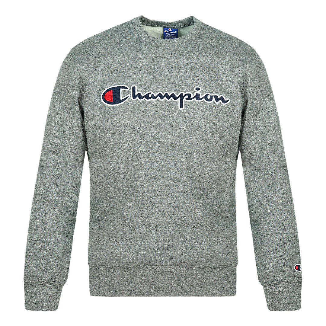 Champion Classic Script Logo Light Grey Sweatshirt. Champion Grey Crew Neck Jumper. Branded Logo On Chest. 100% Cotton. Elasticated Sleeve and Waist Endings. Product Code - 214720 EM526