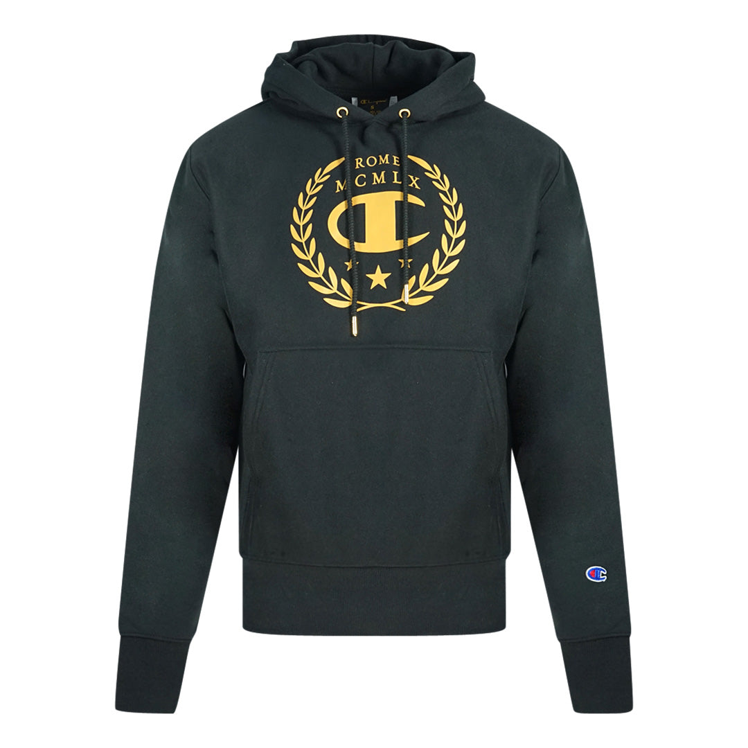 Champion Rome Logo Black Hoodie. Champion Black Hoodie. Elasticated Sleeve Ends and Waist, Drawstring Hood. Front Pockets. 84% Cotton 16% Polyester. Style Code: 217611 KK004