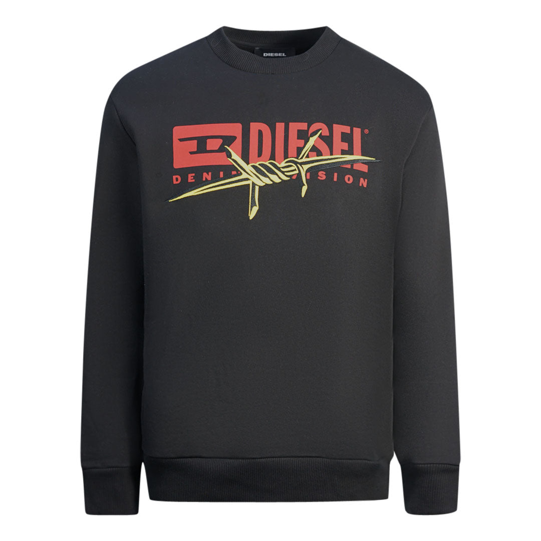 Diesel S-Bay-BX5 Black Sweater. Diesel Black Jumper. 100% Cotton, Large Graphic On Front. Crew Neck, Long Sleeves. Elasticated Neck, Sleeve Ends and Bottom. Style: S-Bay-BX5 0IAJH 900