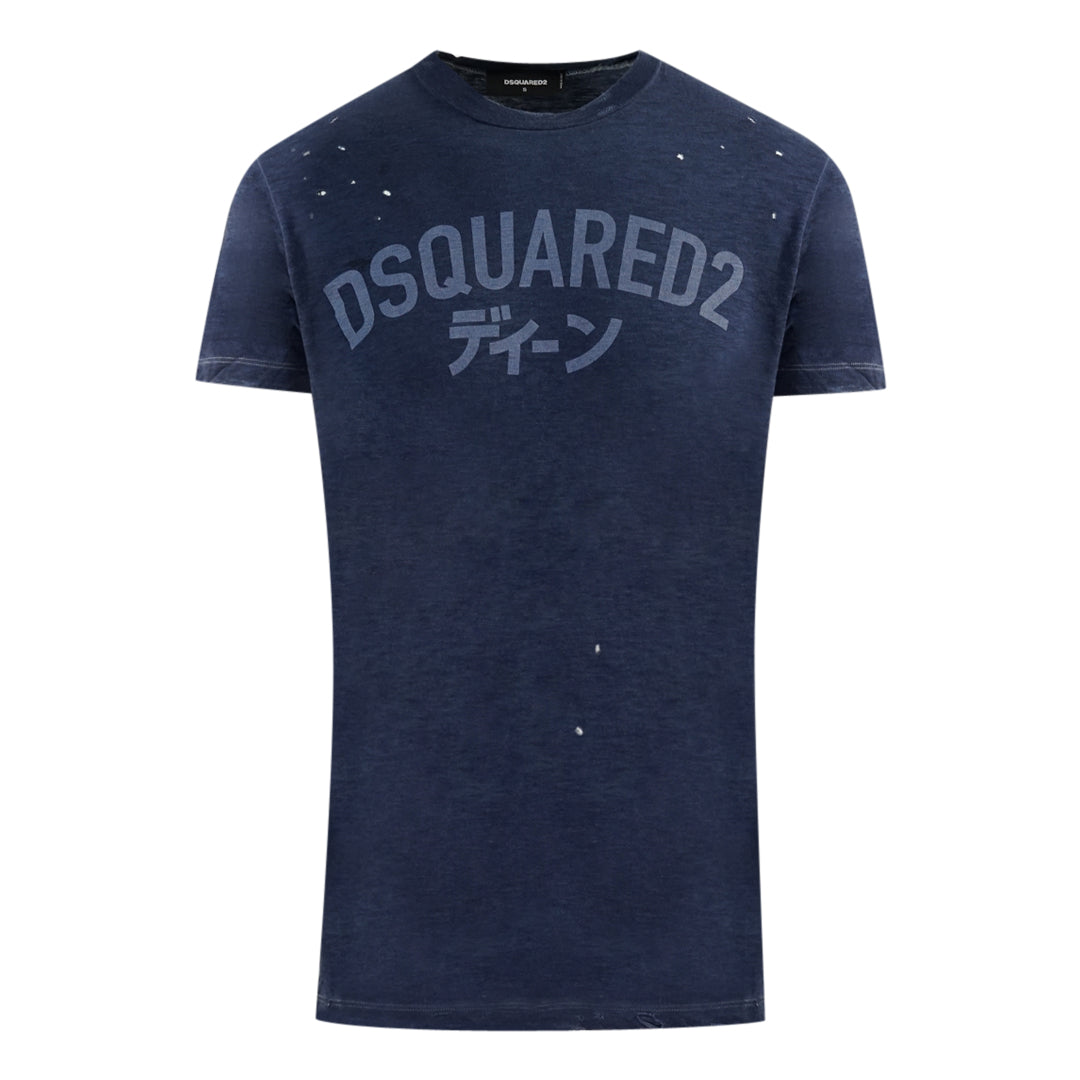 DSquared2 S71GD0416 S22146 478 T-Shirt. Navy Blue Short Sleeved T-Shirt. "DSQUARED2" Written On Front. Chineese Symbols On Front. Crew Neck. Made in Italy