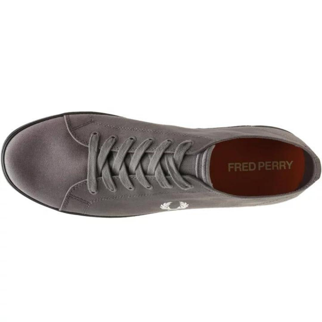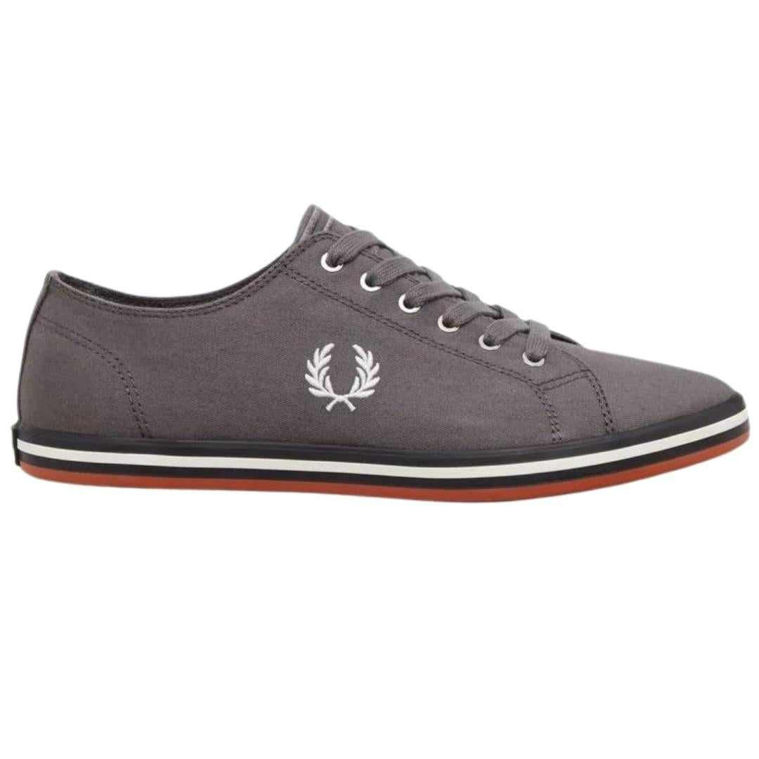 Fred Perry B7259 M75 Kingston Twill Grey Trainers. Fred Perry Grey Trainers. Branded Logo On Tounge. Lace Fasten Trainers. Branded Badge On Side Of Shoe. Style: B7259 M75