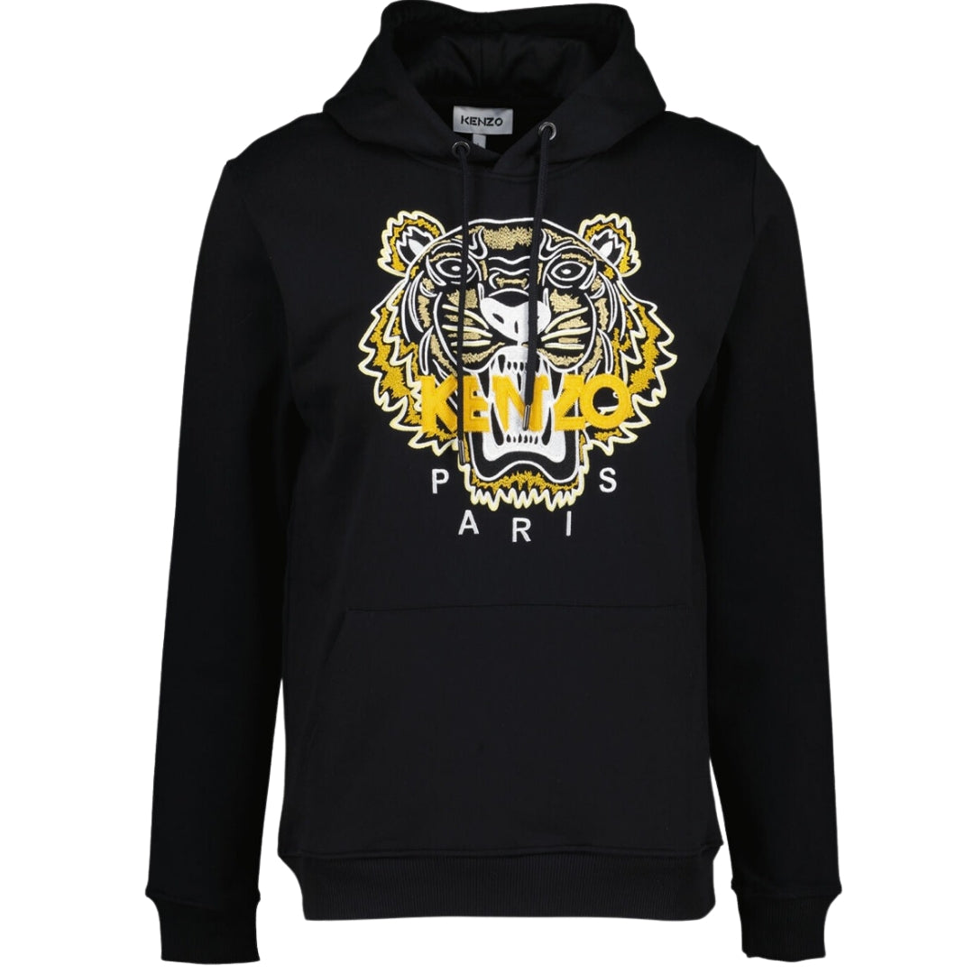 Kenzo Tiger Embroidered Varsity Icon Black Hoodie. Stay warm and stylish in this Kenzo Jumper! Featuring a varsity tiger logo, this classic design will never go out of style. Enjoy a cozy fit and superior comfort all season long. Get ready to turn heads!. 100% Cotton, Kenzo Tiger Icon Logo. Logo Design On Chest, Long Sleeves, Large Kangaroo pocket. Regular Fit, Fits True To Size, Hooded Jumper. Style: 5SW129 99