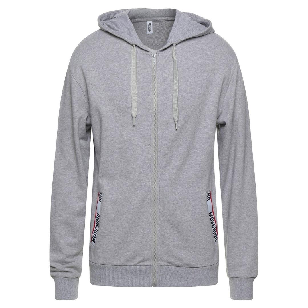 Moschino Brand Taped Pockets Grey Zip Hoodie. Moschino Brand Taped Pockets Grey Zip Hoodie. Elasticated Sleeve Ends and Waist, Drawstring Hood. Front Zip Closure, Front Pockets. Moschino Branding On Pockets. Style Code: A1705 8120 0489