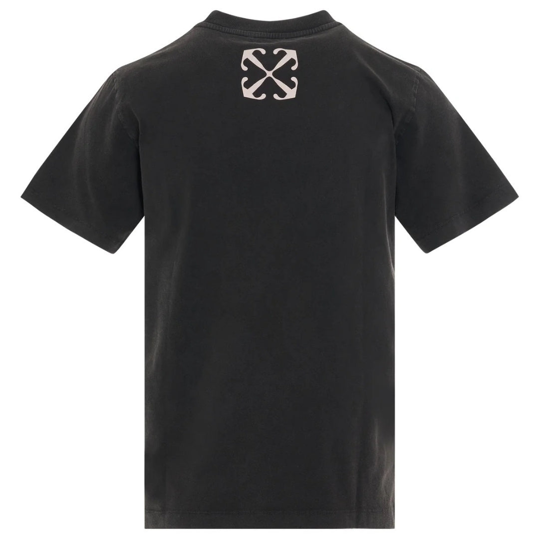 Off-White St Matthew Slim Black T-Shirt. Stay stylish with this Off-White Slim Fit T-shirt. Featuring an iconic Painting on the Front, this Tee is sure to be a conversation starter. Show off your unique style!. Iconic Logo On Front and Back. Off-White Faded Black Tee, Slim Fit. 100% Cotton, Made In Portugal, Crew Neck, Streetwear,, Short Sleeve. Style Code: OMAA027F23JER0041084