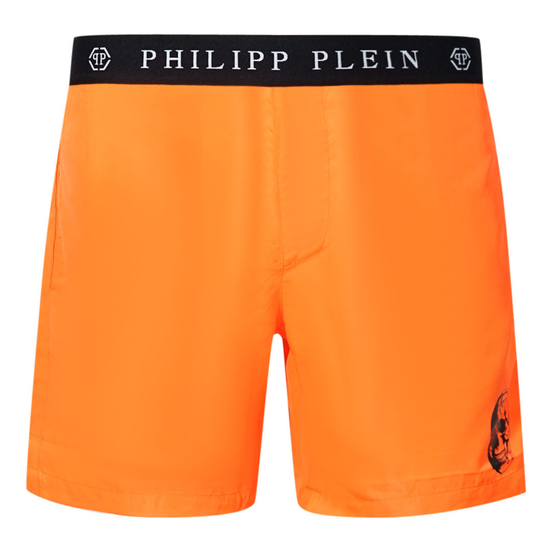 Philipp Plein Branded Waistband Orange Swim Shorts. Be beach-ready in the Plein Orange Swim Shorts. The plain branded waistband adds just the right amount of branding to the look. Enjoy your warm weather days with confidence and style.. Elasticated Waistband, Philipp Plein Orange Swim Shorts. Branded Drawstring Fasten, branded Waistband, Skull Design On Left Leg. Medium Boardshort Style, 100% Polyester. Product Code - CUPP14M01 50