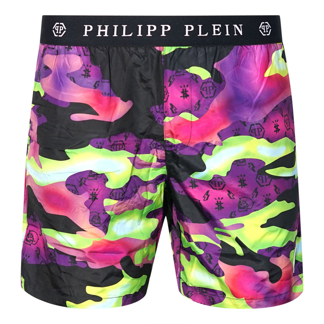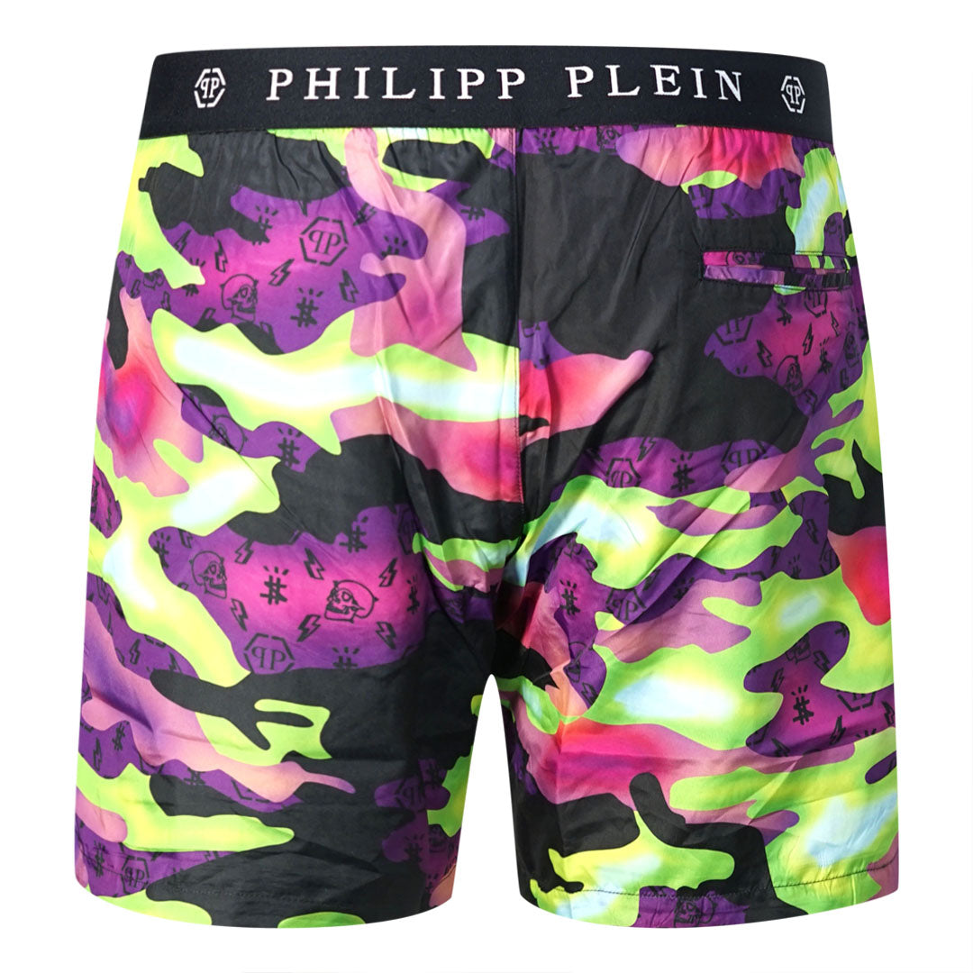 Philipp Plein Camouflage Green Swim Shorts. Make a daring statement in Plein bold camo Green swim shorts. Featuring an eye-catching paint splattered design in camo green, these chic trunks make any poolside look pop. Dare to stand out!. Elasticated Waistband, Philipp Plein Camo Green Swim Shorts. Branded Drawstring Fasten. Medium Boardshort Style, 100% Polyester. Product Code - CUPP12M01 60