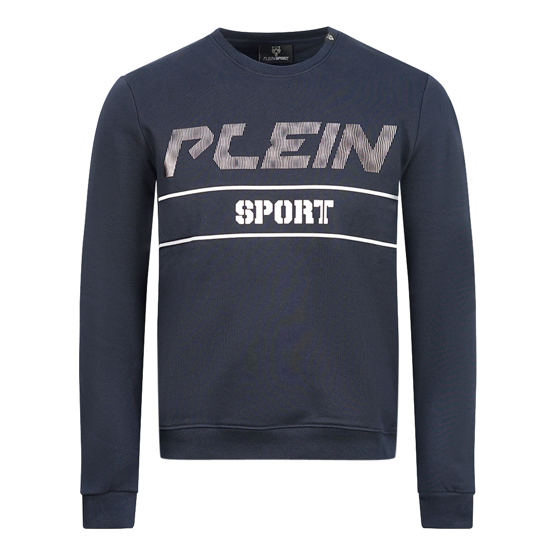 Philipp Plein Sport Black Bold Logo Navy Blue Jumper. Philipp Plein Sport Navy Blue Jumper. 51% Cotton 49% Polyester, Long Sleeve, Round Neck. Large Plein Branding On The Front. Plein Branded Badges, Elasticated Waist and Sleeve Endings. Style Code: FIPS211 85