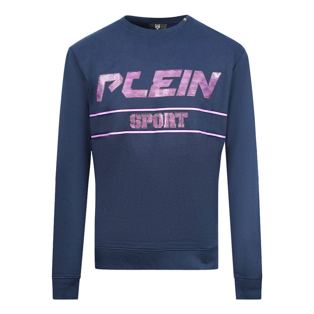Philipp Plein Sport Purple Bold Logo Navy Blue Jumper. Philipp Plein Sport Navy Blue Jumper. 51% Cotton 49% Polyester, Long Sleeve, Round Neck. Large Plein Branding On The Front. Plein Branded Badges, Elasticated Waist and Sleeve Endings. Style Code: FIPS211 85