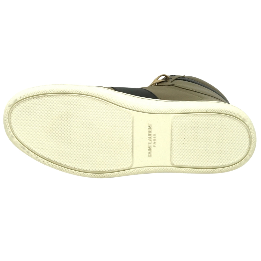 Saint Laurent Green High Top Sneaker. Step out in style with the Saint Laurent Green Sneaker! This streetwear favorite features a modern and edgy look. Perfect for a night out or a casual day, you'll be in comfort and looking great. Make a statement and get the shoe now!. Lace Fasten. Rubber Sole. 100% Leather, High Top. Style Code: 418026 CN440 2966