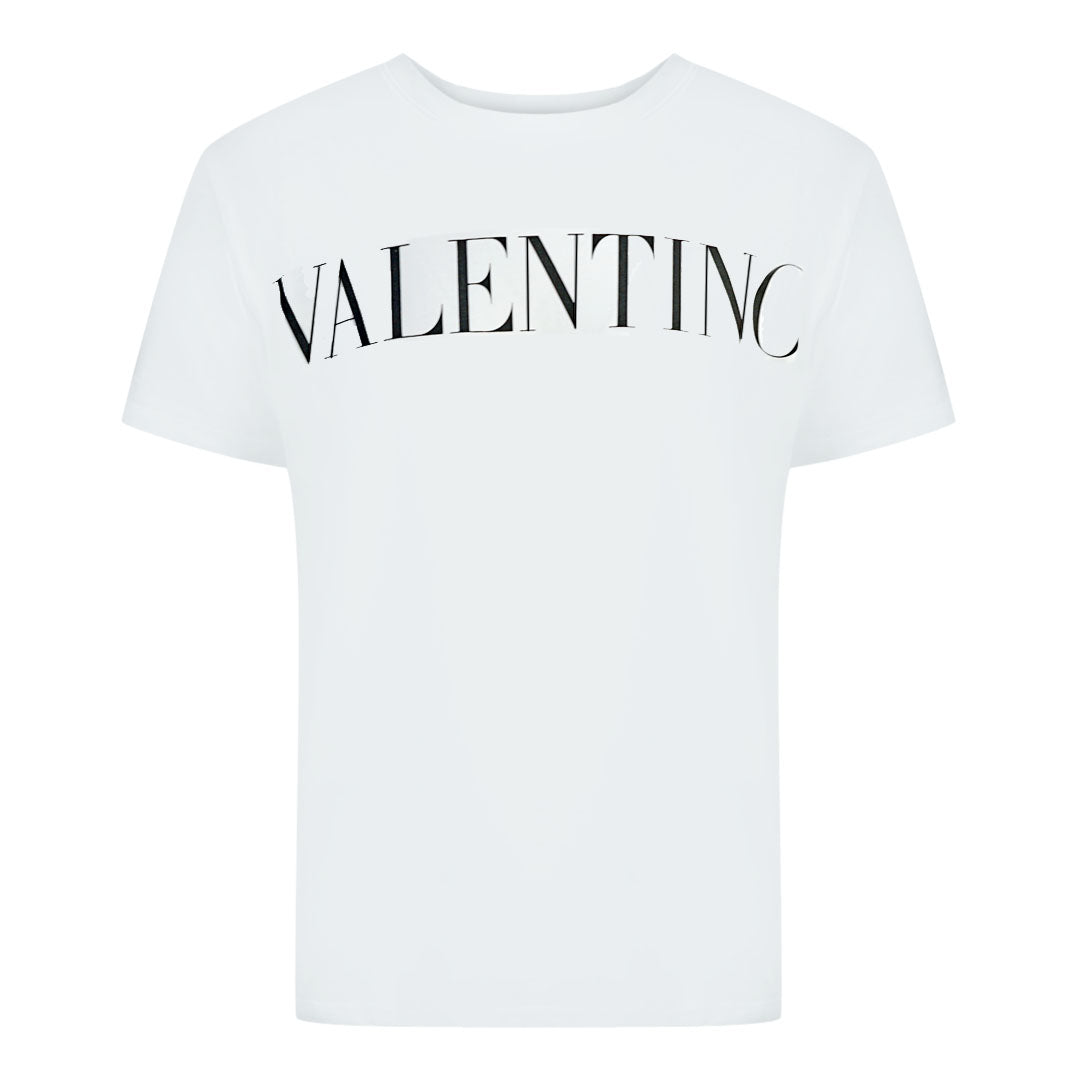 Valentino Large Branded Logo White T-Shirt. This Valentino T-Shirt features Large Branded logo, printed on a comfortable cotton-blend short-sleeved tee. Perfect for casual wear or everyday occasions.. Regular Fit Style, Fits True To Size, Valentino White Tee. 100% Cotton, White tee With Short Sleeves. Valentino Design On Front, Crew Neck. WVOMG10W7SS A01